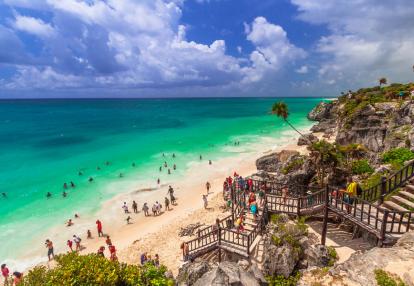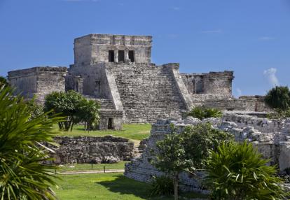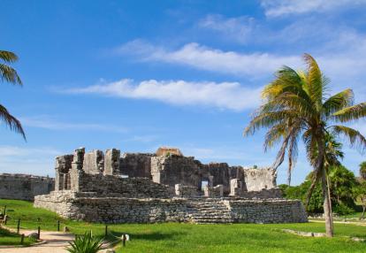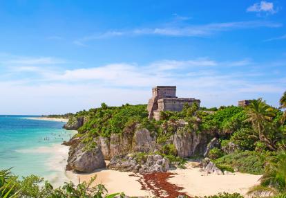 Tulum, dont le nom signifie « forteresse », est l'unique cité maya à avoir été construite en bord de mer. A ses pieds, l'on y découvre une longue et magnifique plage de sable fin, qui s'étale sur des kilomètres au bord d'une eau turquoise et translucide. C'est d'ailleurs sur cette eau que les Mayas virent débarquer les premiers colons espagnols au début du 16e siècle.